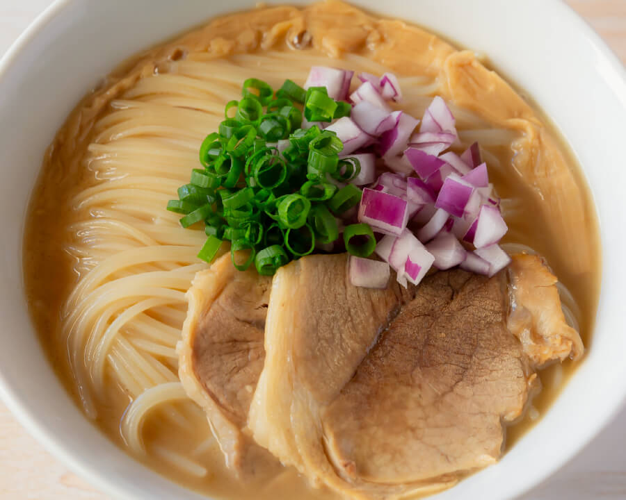 米粉由来のグルテンフリー(GF)の中太麺は、ラーメン特有のコシと風味が特徴です。滑らかな麺の表面に、濃厚な白湯スープが絡み、噛めば鶏の旨みと見事に調和。